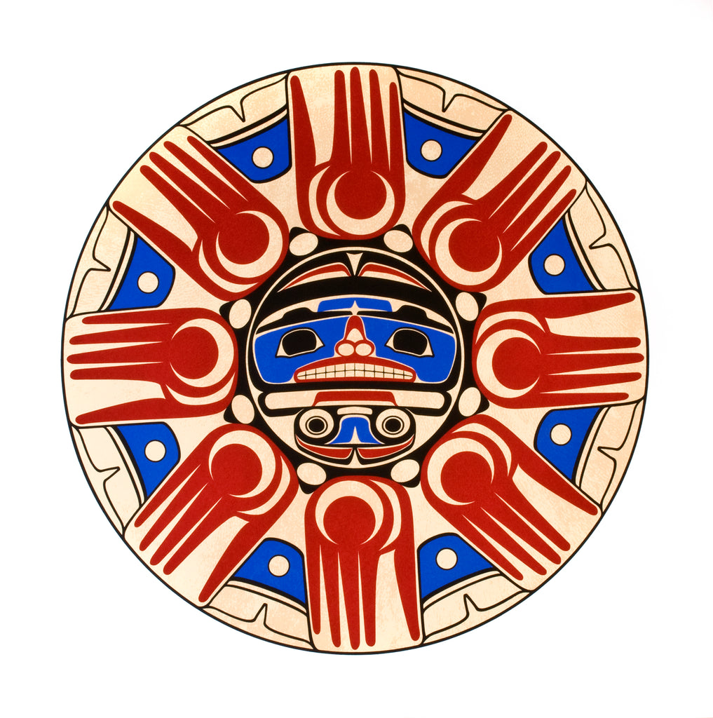 This drum design has been with me for a few years and it is finally time to release it as part of a thirteen print series of moons. Here on Saanich Peninsula the moon in April is called the moon of Opening Hands. This is the time of year when all the leaves are opening up and the smells of Spring fill the air. The flowers bloom and nature awakens from a winter of slumber. So I call this image Opening Hands Moon.