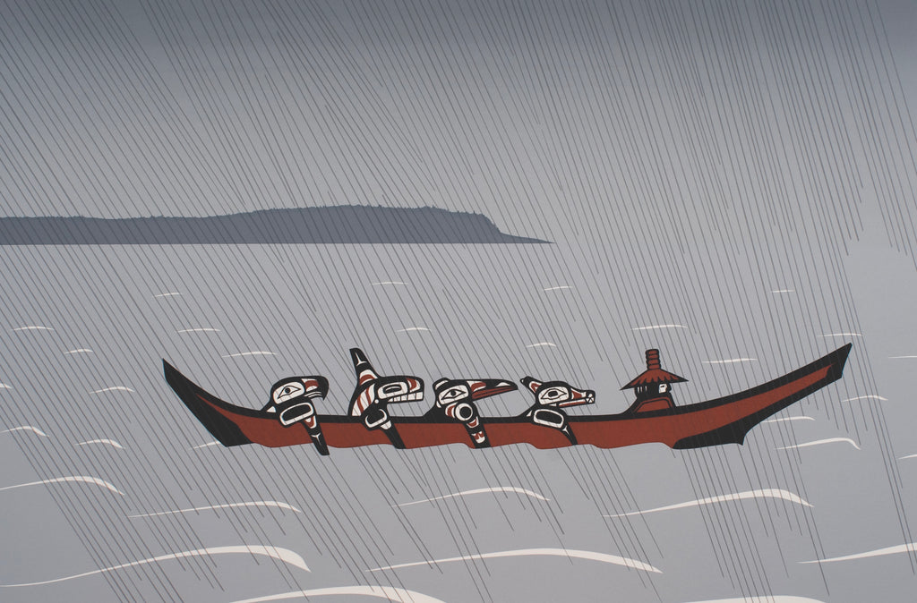 The Tsimshian canoe has inside it a chief and four supernatural chiefs. Chief’s Dream is set on a stormy, rainy autumn day. The landfall is the Northern tip of Banks Island. The water is Principal Channel just south of Kitkatla. The figures in the canoe are the supernatural chiefs of the four tribes of the Tsimshian people of Kitkatla: The Eagle, Raven, Whale, and the Wolf. The young chief dreams of going to a potlatch with supernatural chiefs powering his canoe towards Kitkatla.