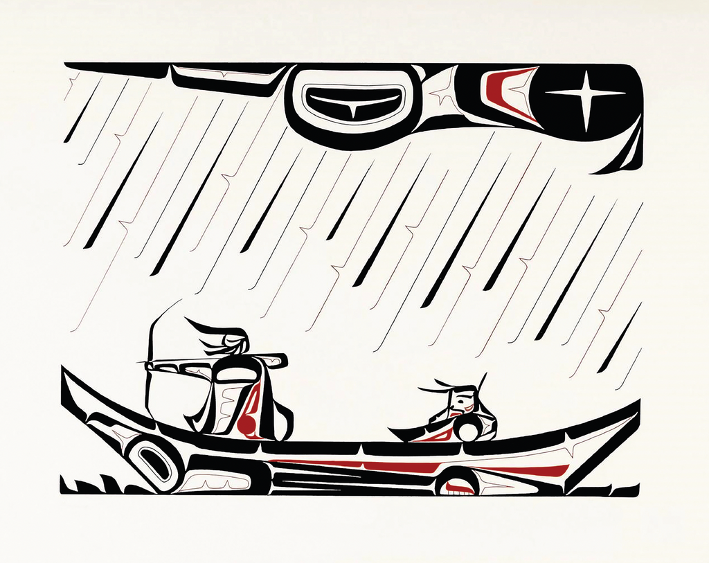 The day is windy, with a frequent downpour of rain commonly experienced on the coast. The stern man is holding the canoe back as the wind tries to blow them forward too quickly. The hunter cries, “Oola! Oola!” (Seal! Seal!), and the bowman is ready for the shot.
