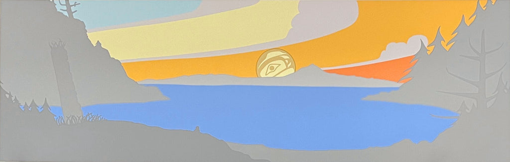 A Quiet Place I & II were made using the same serigraph stencil, but with different colour palettes. These prints were made after a trip to Haida Gwaii, where he was moved by a totem pole that was half-fallen over with grass growing out of it.