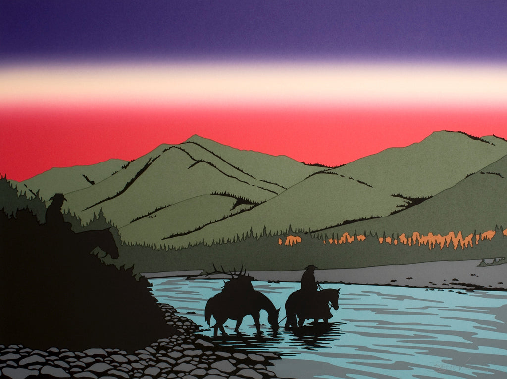 The crossing portrays the fulfillment of a dream. My friend Larry and I have finally done something we spoke of twenty years ago when I worked for the Saanich Fire Department in Victoria, B.C. We have taken the time to go hunting on horseback in the Rocky Mountains. I will never forget the day we rode back to camp with my first elk, looking forward to a good meal, a campfire, and a night’s sleep.