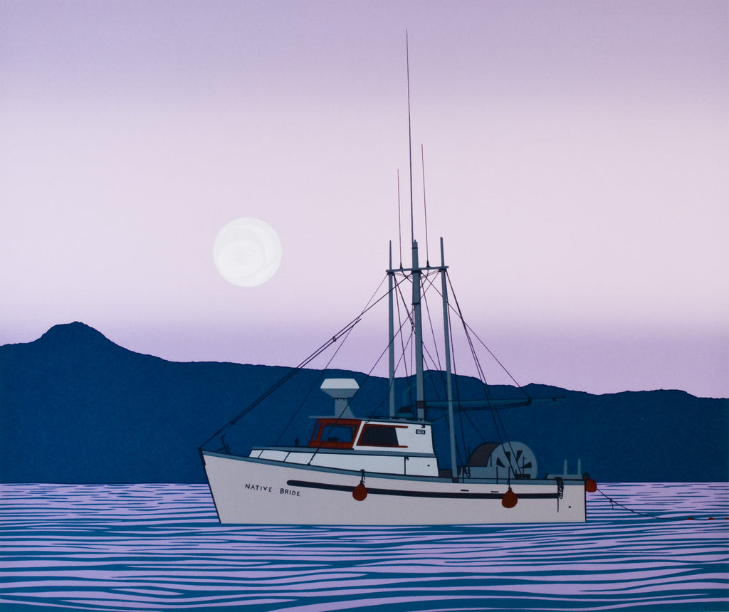 One of my first trips was to the Principle Channel and Mink Trap, a traditional fishing area for the people of Kitkatla. This view of the Native Bride is from my dinghy at five o'clock in the morning. The sun has yet to rise, but dawn has come to the coast, and the salmon moon is bidding me farewell for the day.