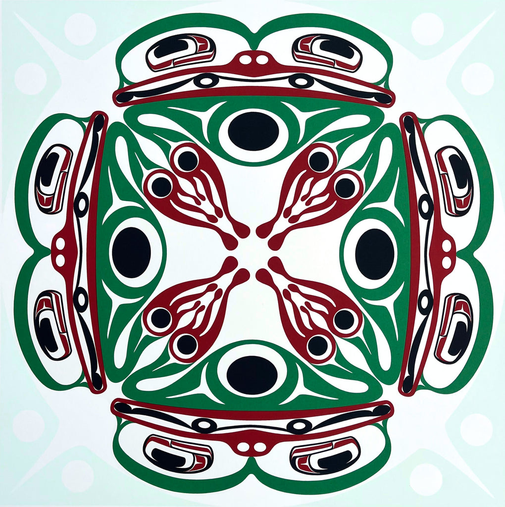The frog is a powerful symbol of transformation for the Gitxsan people of the Skeena valley and has been a clan crest for thousands of years. There are many dances, and songs belonging to those people of the frog clan. One day I was inspired by some people of the frog clan to create this design for a large drum. The drum is in the process of creation. In the meantime, through the magic of hand-pulled screened prints, I get to share this design I call, Four Frogs.