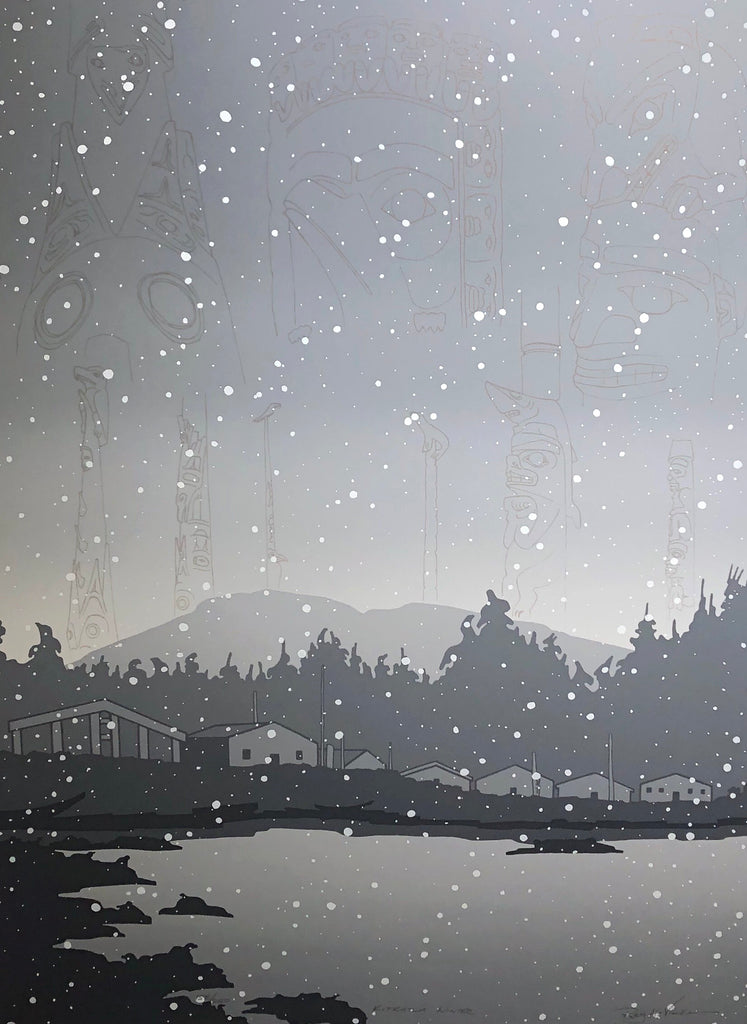 As a Lach Klan (Kitkatla) member, I am connected by a slim thread to an ancient culture. The Tsimshian culture was developed many centuries prior to European contact. The society that existed at the time of contact with Europeans was complex and sophisticated. The artistic expression of my ancestors was equal to any that has been in the history of man. The village of Kitkatla existed prior to the pyramids of Egypt and continues today in an unbroken habituation of some five thousand years or more. During my life, I have witnessed a cultural genocide and its effects on our modern-day civilization. The gradual erosion of traditional values - our spiritual, physical and intellectual relationship to our land. I remember the half dozen or so totems that still stood in the village of my childhood. I can still feel an emotional memory, the sense of community. I recall the sharing of meat by the hunters and fisherman, the first electric generator, oil stoves and heaters, the first social assistance or welfare cheques from the Department of Indian Affairs, food allowance, television and the time when aboriginals were first allowed to buy liquor, the breakdown of the family structure and a continuing legacy of abuse and rise of alcoholism. The generations of abuse have spawned a group of people who are dependent on a dominant culture and paternalistic Department of Indian Affairs. I see today a growing minority who have had enough of abuse and its effects. There is a growing number of people who are striving for and living in recovery. People who are facing the generations of co-dependence, who are reclaiming their identity, their sense of belonging, self-worth and freedom. Our long winter of discontent is over and, like the new life that comes each Spring, we are learning to live anew. We can live in the joy/pain of recovery. We will learn to be responsible for ourselves and our land. We are learning to be responsible in our inherent right to govern our destiny. We are realizing the tremendous wealth of human resource that we are as aboriginal people of Canada. We are becoming aware of the importance of our contribution to the world in which we live. These works of Kitkatla Winter and Kitkatla Spring are symbolic of no longer running from the past, but embracing it and being in the here and now. And so it is to move from Winter into Spring.