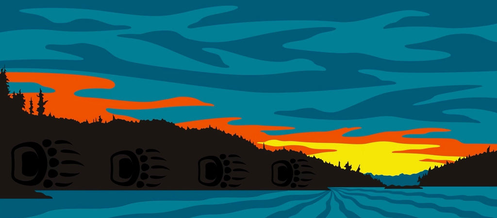 It was a lovely coastal evening in late May. My friend Norm Larsen and I traveled from Port Edward to a beautiful anchorage we call Bear Bay, situated in our Gitxaala territories. Bear Bay has been a traditional harvesting area for thousands of years. I feel at home there; I can sense the presence of ancestors when I visit. We were making our way to a new Marina called MK Bay near Kitamaat. There was a beautiful sunset as we relaxed after a long cruise, and I took a few photos.The next day we visited Hartley Bay, then on to Bishop Bay Hot Springs where we enjoyed a wonderful bath. The cruise was full of adventure, as they always are, and we finally reached MK Bay Marina and a new berth for the M.V. Andrea Marie.I received a call from MK Bay two days later. A storm came up the inlet; the waves washed over the stern and sunk my boat. She is gone forever, and I treasure the memories that remain. There are a number of artworks created from ocean voyages over the years, and this creation is the last.My memory goes back to that last anchorage at Bear Bay which inspired this creation appropriately titled, Last Anchorage.
