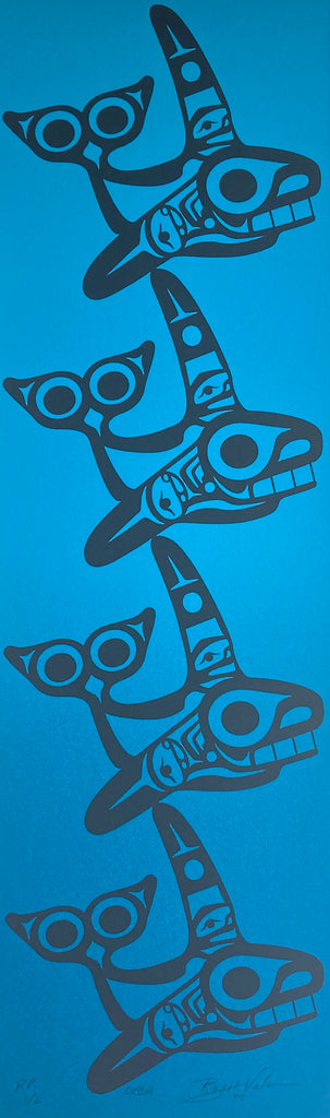 Over thirty years ago I picked up a book called“Primitive Art” by Frank Boas. This book is about art from different countries around the world, with a selection on the Northwest Coast. This section contains a few drawings of Tsimshian sculptures and I was thrilled to see the art of my ancestors. There is one drawing in particular of a whale that I have enjoyed for all this time. This drawing has finally inspired me to create my own work called Orca and so I share this work with you today. So it is that this rendition of Orca was inspired by a work over a century old that was sketched by an observer and published in a book. The four Orcas represent the four seasons of the world and the four generations from the time of European contact with my father’s people to myself.