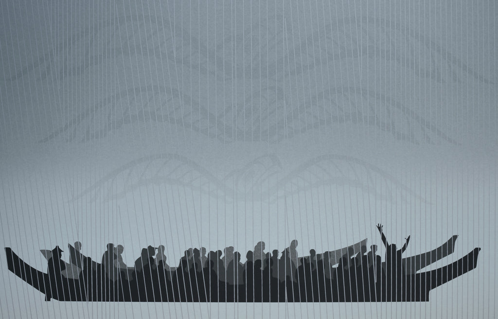 The rain floods the Earth and villagers have no choice but to abandon their homes and flee to their canoes. As the seas rise, the villagers tie themselves to the top of Anchor Mountain, where they pray for days on end and promise to teach their children to value all life. The storm stops and the waters recede. From that point on, the villagers appoint a chief to perform the Peace Dance at every potlatch and, with it, pass on the story of the flood and the importance of respect.