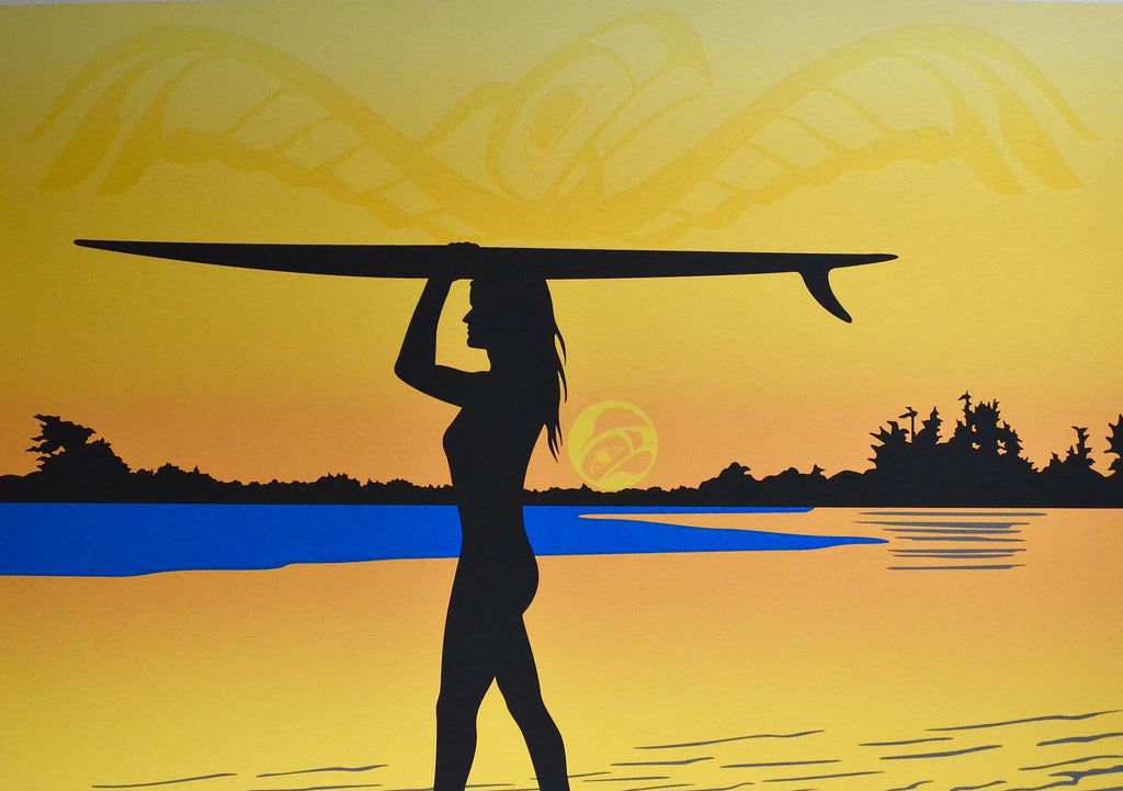 The surf calls so many people to Tofino. I’m fortunate to be blessed with a wonderful young lady who came to be a part of the Roy Henry Vickers Gallery for a number of years. She enjoyed the surf and we enjoyed her expertise in the gallery. Cass has moved on to continue her relationship with the sea and the surf and we all miss her in the gallery.