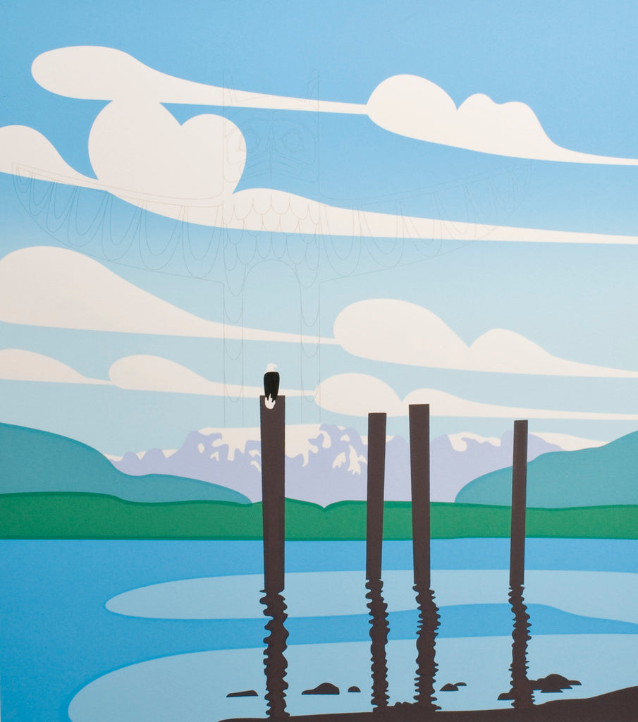 I was intent on finding a scene of the Comox Valley and did not want to create another work illustrating the Comox Glacier. I explored the area and went out on the water to glimpse the old Comox village site and found no inspiration. I continued on to the grounds of the Filberg Lodge to photograph a totem that had recently been raised there. I heard the call of an eagle and stopped to pay attention. I looked toward the ocean and saw the eagle perched atop a piling. The tide was low and I moved closer for a photograph. As I neared the eagle I feared it may take flight and thought instantly it would not, for it had called me. My desire not to use the glacier vanished amid the excitement of finding the magic of Comox and heeding the call of the eagle.