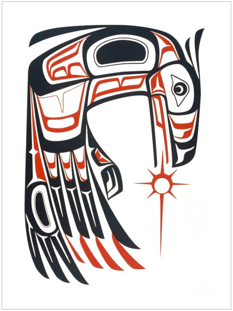 Numerous legends tell of how Raven brought the Sun, Moon, and Stars to the world. Most of these are all creation stories. You may have seen various designs of Raven that show a circular design in the mouth representing a sun or moon.