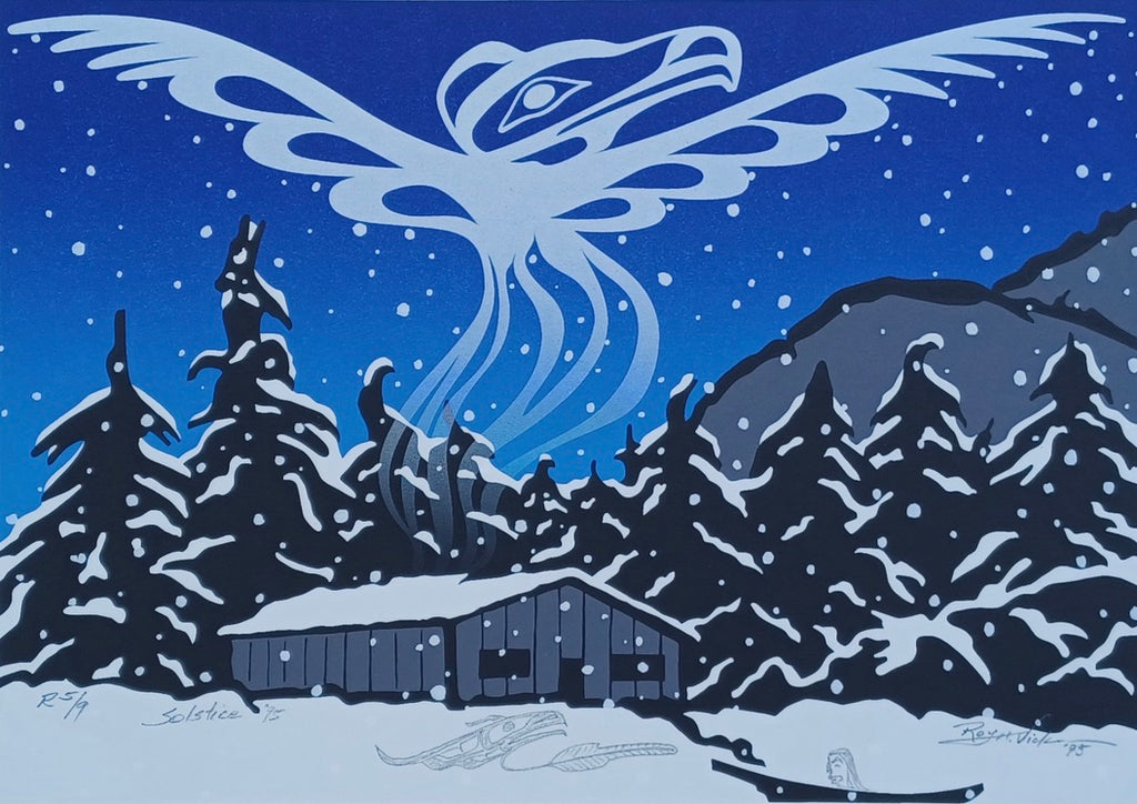 This work brings with it a notice to all our friends and acquaintances that we moved. The white raven is symbolic of our Creator. The Longhouse with smoke rising represents our new home and our presence in it. The snow falls to blanket Mother Earth and the seeds that hold the promise of new life in Spring.