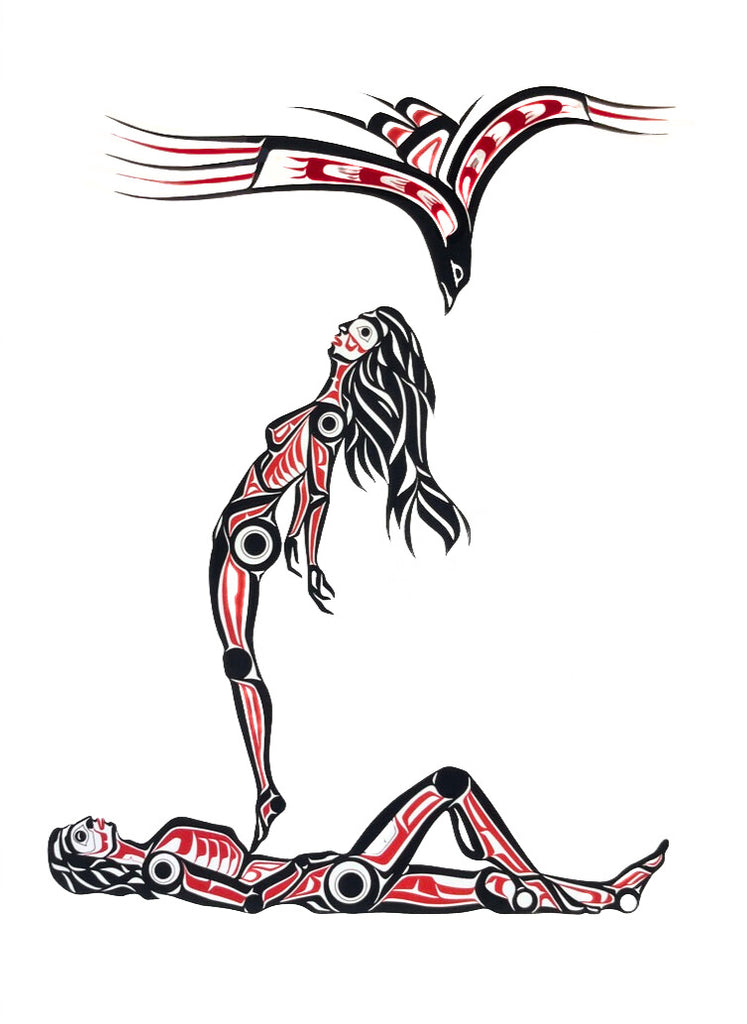 As an artist, I have an ever-ready eye for good works by other artists. There is one artist in particular whose work I find fascinating - Albrecht Durer. I saw his rendition, which illustrates the Biblical account of the creation of Eve. It inspired me to create the same scene from the mind of someone who could only work with the traditional shapes and colours of Tsimshian art.