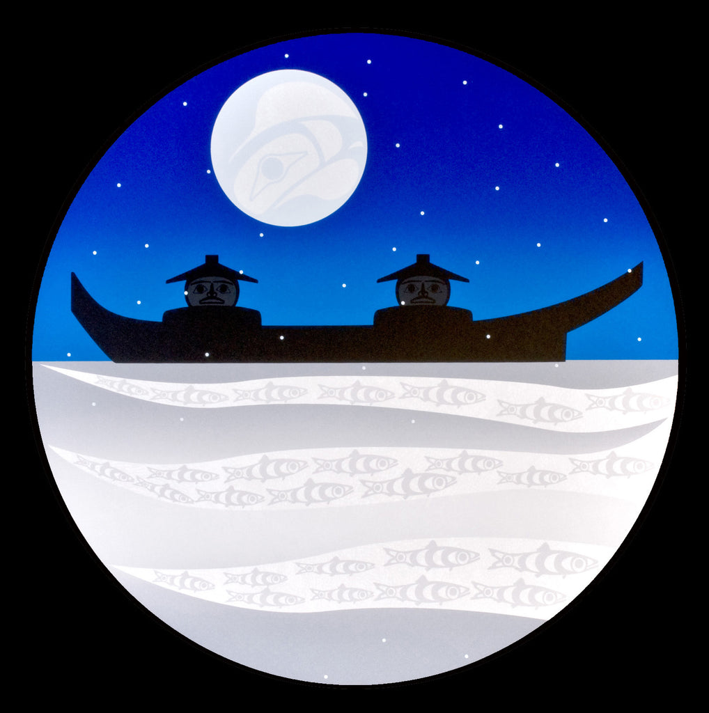 So this is a rendition showing people in a canoe who have just found the creamy color in the ocean during the moon of Milky Waters.
