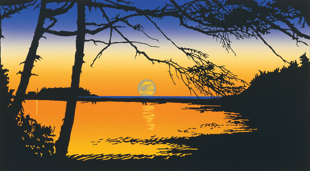 During the first week of September 1997, I returned to the beach on one of my many visits to Tofino and Eagle Aerie Gallery. It was Saturday and the late afternoon was peaceful and clear as dusk approached. My excitement was high in anticipation of a sunset. It was not long before I found myself at the end of the beach with a camera in hand, attempting to catch the magic. I was standing in a cleft in the rocks watching the shadows lengthen with the setting sun. The tide was out, and the colors reflected in the wet sand. There were silhouettes of four people walking the beach, and their presence reminded me that I am never alone.